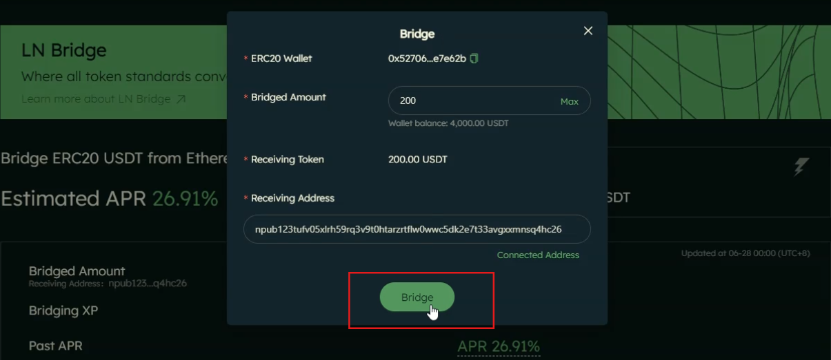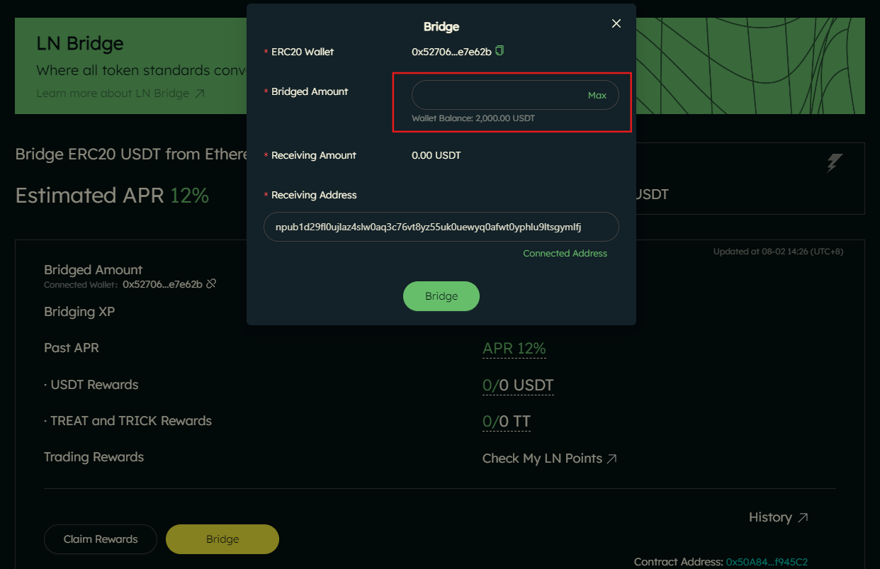Rewards will be updated and accounted for on a regular basis. LN Bridge users will earn APR for bridging USDT into Lnfi. The APR includes both USDT rewards APR, generated from staking on DeFi apps on Ethereum, and TREAT/TRICK rewards APR, as part of protocol incentives. The past APR, which aims to provide an indicative ongoing APR, is calculated based on the last period’s Bridge XP.
