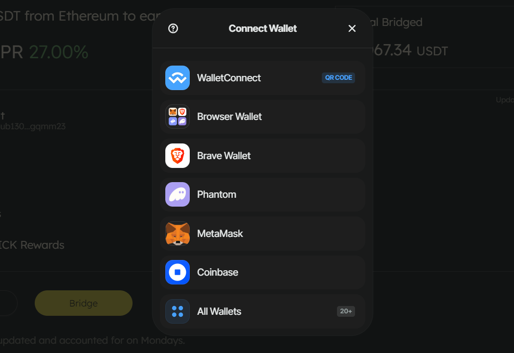 To start bridging, you need to connect your wallet first. Tap on the “Bridge” button.