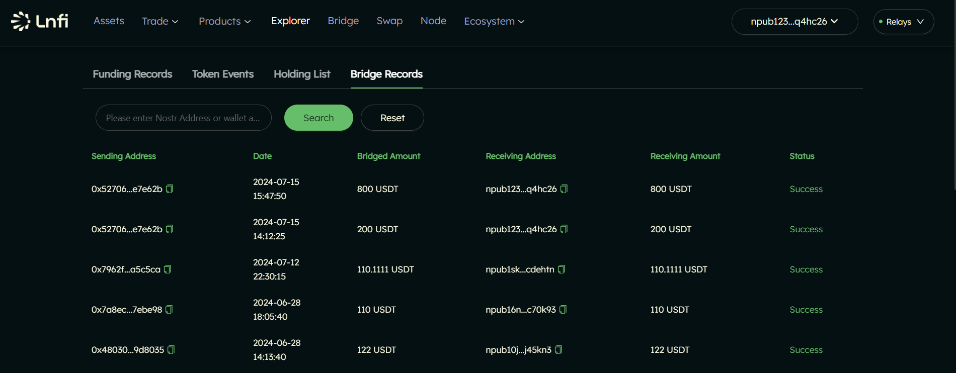<figure><img src="https://234049135-files.gitbook.io/~/files/v0/b/gitbook-x-prod.appspot.com/o/spaces%2FtqpzBLUkh19rkHwMxgKf%2Fuploads%2Fgit-blob-f549034ea5ba3b518371506e96fd6226a8d3ed66%2Fimage%20(13).png?alt=media" alt=""><figcaption><p>Search for your own npub address to find your bridge records</p></figcaption></figure>